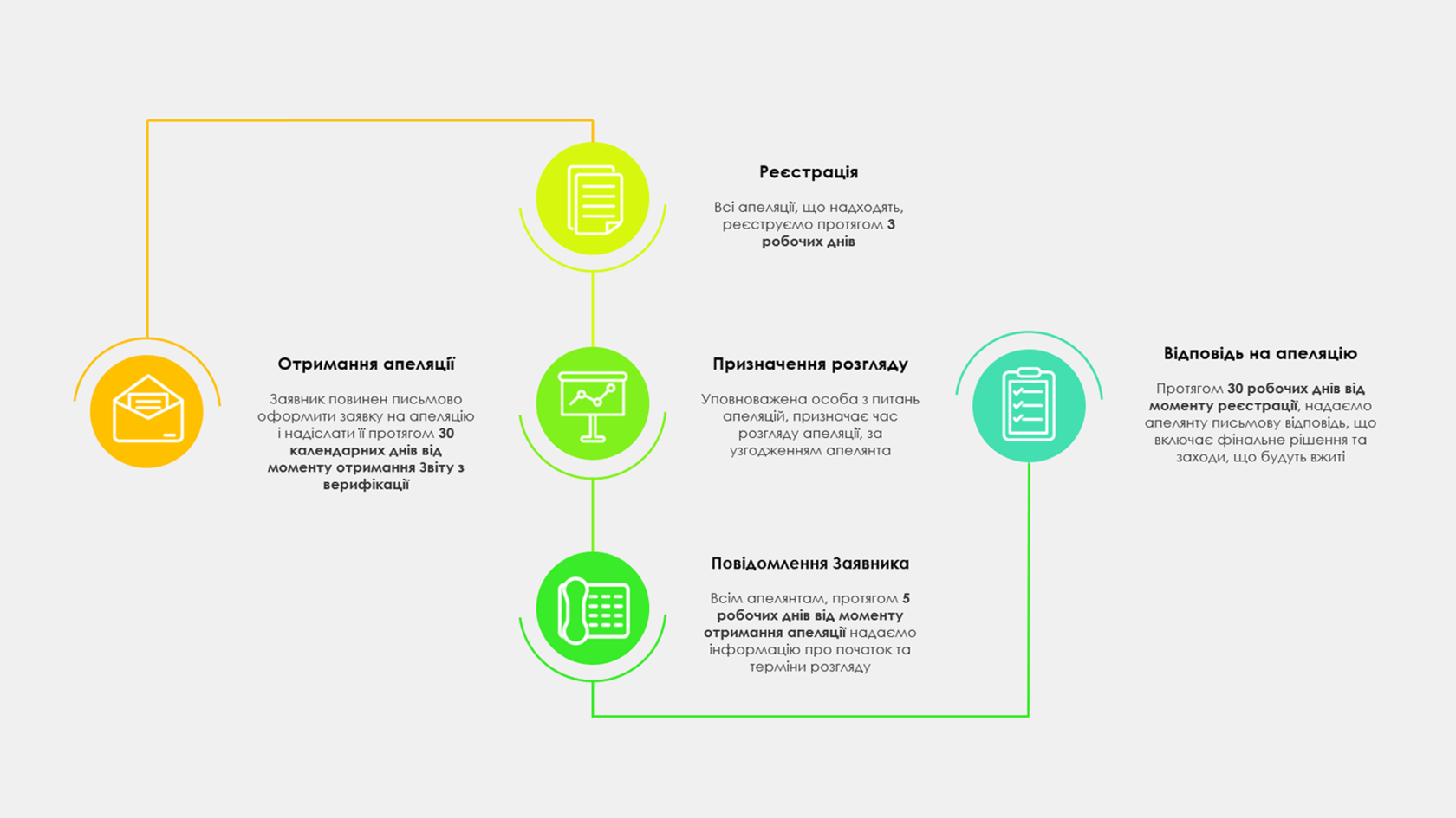 Всі оператори установок, які проходили верифікацію у ТОВ «ВЕРУМ КАРБОН» і не погоджуються з остаточним рішенням можуть подати апеляцію протягом 30 календарних днів з моменту отримання Звіту з верифікації.